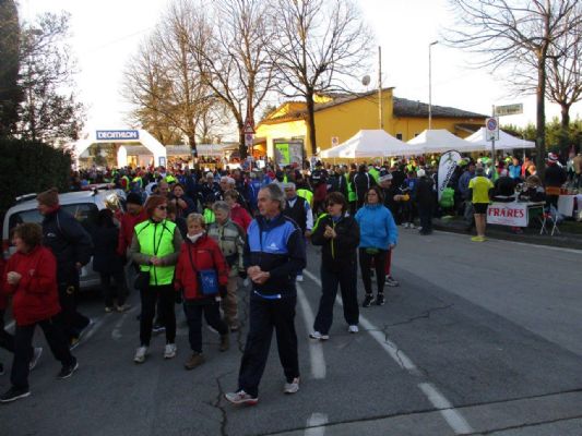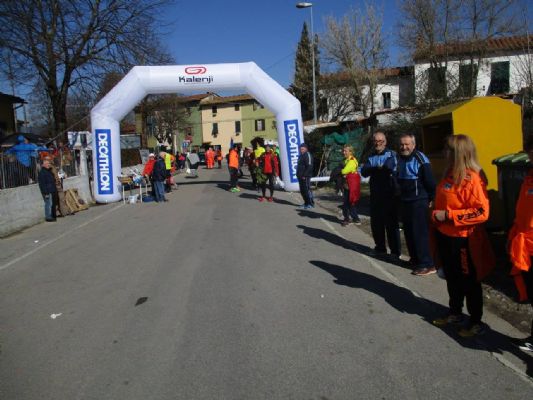 A Molin Nuovo per la marcia dei cinque Comuni: Chiesina Uzz. Borgo a Buggiano, Buggiano, Uzzano e Pescia?. Alla partenza un raduno di cocoriti brasiliani, con becco ricurvo e penne variopinte. Il Carnevale impazzava a Molin Nuovo. Io partendo presto ho invece visto la brinata che imbiancava i campi e raffreddava le orecchie. Facendo il percorso lungo mi son voluto godere i colli che gli organizzatori ci hanno voluto far vedere. Attraversato il centro del Borgo viste la stazione e le scuole siamo saliti verso Buggiano per una strada ripida, perchè qui le salite sono ripide e siccome anche le discese, se le prendi in modo contrario sono salite, anche queste sono ripide. Buggiano ci guardava assonnato e forse i suoi abitanti dormivano. Nessuno, solo bandierine...al vento. Certo se invece di podisti fossero arrivati i lanzichenetti come "ai bei tempi"....Il sole esaltava l'alta chiesa e il campanile, ma noi scendevamo dietro, quasi per non farci vedere e tornavamo giù al Borgo appena in tempo per prendere la salita per Stignano. La chiesa e la torre dirimpetto al ristoro, appena un saluto e via verso La Costa, sentiero duro come la fame antica, e alla chiesa lasciamo la 12 che scende mentre noi saliamo sulla via di Malocchio plannando poi a Uzzano. Un ristoro bello e salita che se invece di camminare chinato in avanti, ti veniva da stirarti, ribaltavi indietro. Immaginavo i sassi rotolanti lanciati dagli uzzanesi o peggio ancora gavettoni di olio infuocato, menomale che non sono più di moda!!!