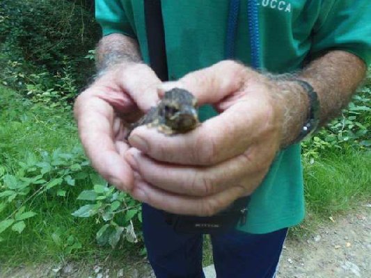 un piccolo uccello forse caduto dal nido, nelle grosse mani di un podista