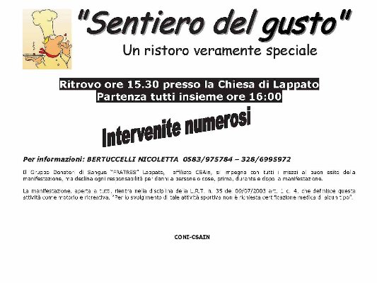A questo punto non mi resta che ringraziare tutti coloro che anche quest’anno hanno voluto sostenerci per la realizzazione della “4 Passi in Collina”: vi aspettiamo come sempre numerosi il 16 maggio sul Piazzale della Chiesa di Lappato per partire tutti insieme, goderci la bellezza e la fatica della corsa ma soprattutto…premiarci alla fine con il giro di campo tra le prelibatezze del “Sentiero del Gusto”!!!